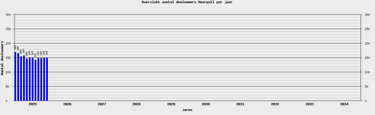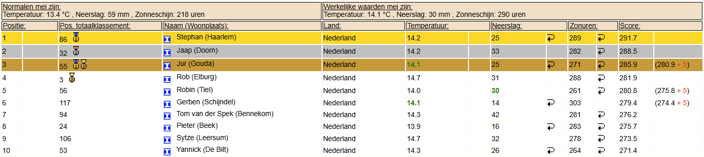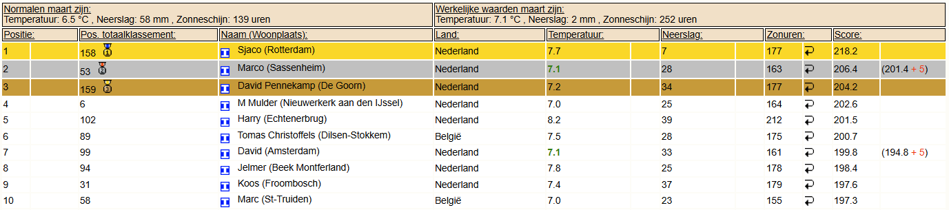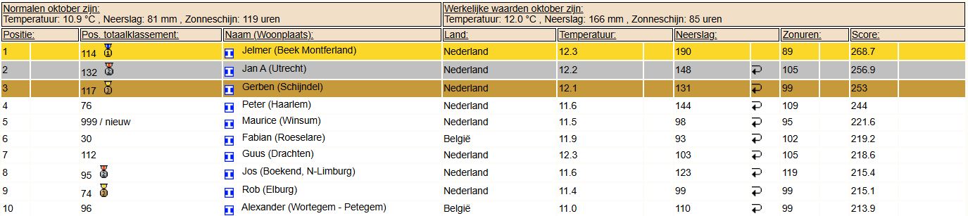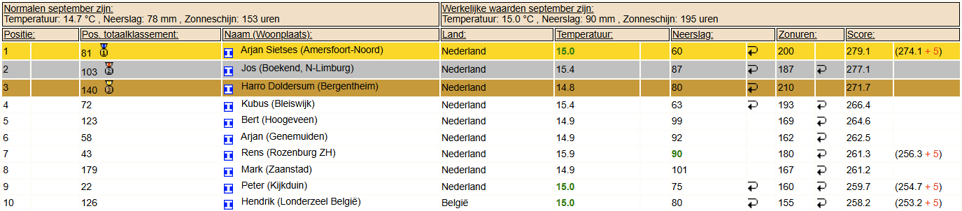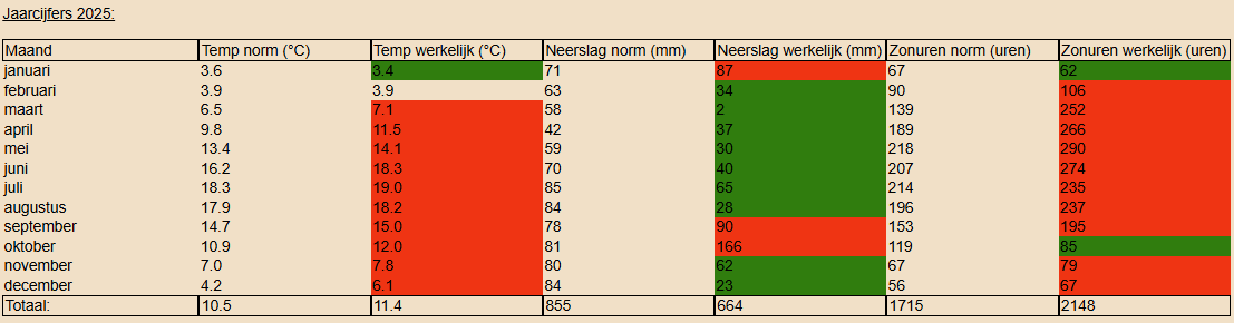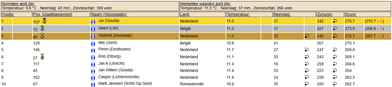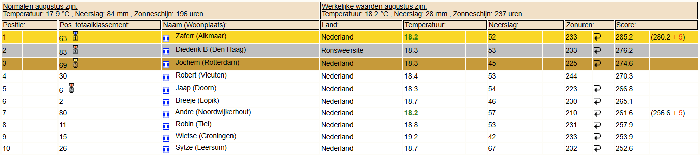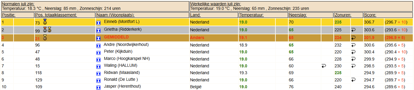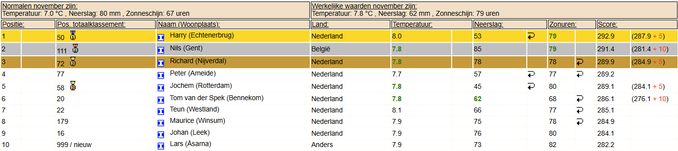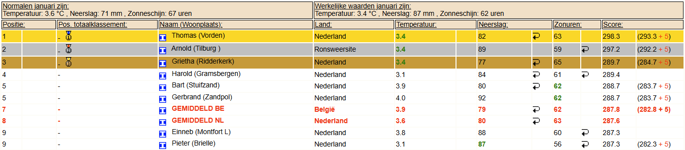 | Jaaroverzicht Weerpoll 2025: Het 21e jaar van de Weerpoll had een gemiddeld aantal deelnemers van 152 per maand. Dat was iets minder dan het gemiddelde van de afgelopen 10 jaar, wat een gemiddelde opleverde van 156 deelnemers per maand. In totaal speelden er 187 verschillende mensen één of meer keer mee afgelopen jaar. ![]() Het jaar 2025 was als geheel 0,9 graad te warm (11,4°C tegen 10,5°C normaal) ten opzichten van de normaal. In 10 van de 12 maanden eindigde de gemiddelde temperatuur boven normaal. Alleen in januari lag het gemiddelde onder normaal, terwijl deze in februari exact gelijk was aan de normaal. De grootste afwijking naar boven trad op in juni, die maand eindigde 2,1°C boven normaal. Qua neerslag was het een droog jaar en kwam de jaarsom in De Bilt uit op 664 mm tegen een normaal van 855 mm. Qua zonuren zaten we in 2025 ruim boven de norm en verliepen maar liefst tien maanden zonniger dan normaal. Alleen in januari (-5) en oktober (-34) scheen de zon minder dan normaal. Het jaar als geheel leverde een overschot op van 424 uur op (2148 uur tegen normaal 1715 uur). ![]() Januari [tekst] ![]() Februari [tekst] ![]() Maart [tekst] ![]() April [tekst] ![]() Mei [tekst] ![]() Juni [tekst] ![]() Juli [tekst] ![]() Augustus [tekst] ![]() September [tekst] ![]() Oktober [tekst] ![]() November [tekst] ![]() December [tekst] In onderstaande ranglijst zien we dat de winnaars in 2025 vergeleken met andere jaren heel gemiddeld hebben gepresteerd. Een gezamenlijke jaarwinst is echter nog niet eerder gebeurd in de geschiedenis van de Weerpoll, wat het dan toch weer extra speciaal maakt. 2016 - Koos (Froombosch) - 3026.3 punten 2009 - Richard (Rijssen) - 2984.1 punten 2012 - Bart (O.-L.-V.-Waver) - 2958.1 punten 2021 - Koos (Froombosch) - 2949.5 punten 2019 - Harry (Echtenerbrug) - 2939.9 punten 2008 - Dave (Deinze) - 2913.6 punten 2013 - Francien (Sint Nicolaasga) - 2912.7 punten 2025 - Jan Willem (Gouda) / M Mulder (Nieuwerkerk aan den IJssel) - 2882.7 punten 2022 - Erik (Hulsberg) - 2842.9 punten 2015 - Sebas (Weesp) - 2824.1 punten 2014 - Bart (O.-L.-V.-Waver) - 2822.5 punten 2010 - ReFa (Amstelveen) - 2815.2 punten 2017 - Arjan Sietses (Amersfoort-Noord) - 2804.1 punten 2018 - Fabian (Roeselare) - 2793.7 punten 2020 - Tom van der Spek (Bennekom) - 2789.8 punten 2011 - Rico (Hoofddorp) - 2758.1 punten 2007 - Jur (Gouda) - 2688.6 punten 2023 - Erik (Groesbeek) - 2657.2 punten ![]() |